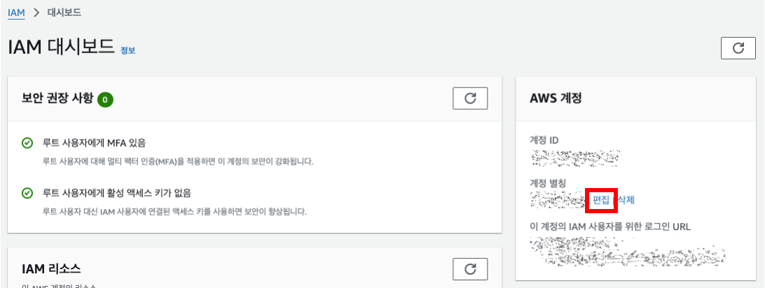 - IAM - AWS 계정 - 계정 별칭 - 편집
