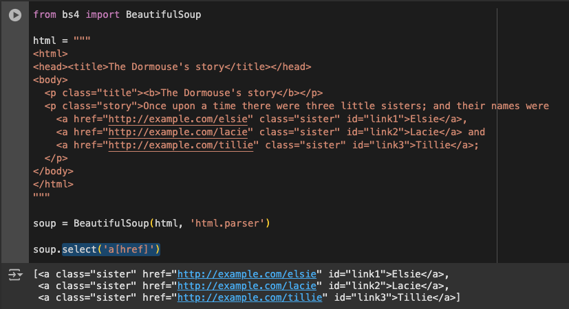 # 결과: [<a class="sister" href="http://example.com/elsie" id="link1">Elsie</a>,