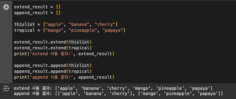 # extend 사용 결과: ['apple', 'banana', 'cherry', 'mango', 'pineapple', 'papaya']