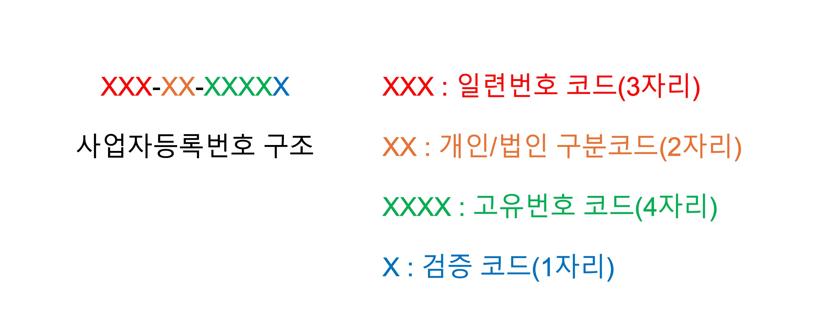 | 법인사업자 | 101-86-54321 | 86: 영리법인의 본점, 5432: 등록 순서. |