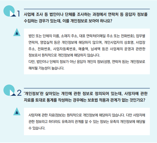 - 설문조사 등에서 수집한 응답자의 이름, 연락처, 이메일 주소 등은 특정 개인을 식별할 수 있으므로 개인정보에 해당합니다.