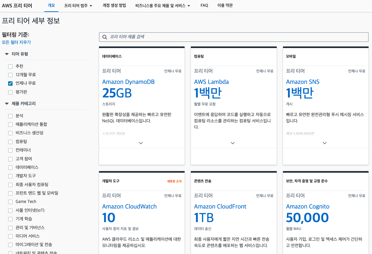 - 12개월의 AWS 프리 티어 기간이 끝나도 자동으로 만료되지 않으며, 기존 및 신규 AWS 고객 모두에게 무기한으로 제공됩니다.