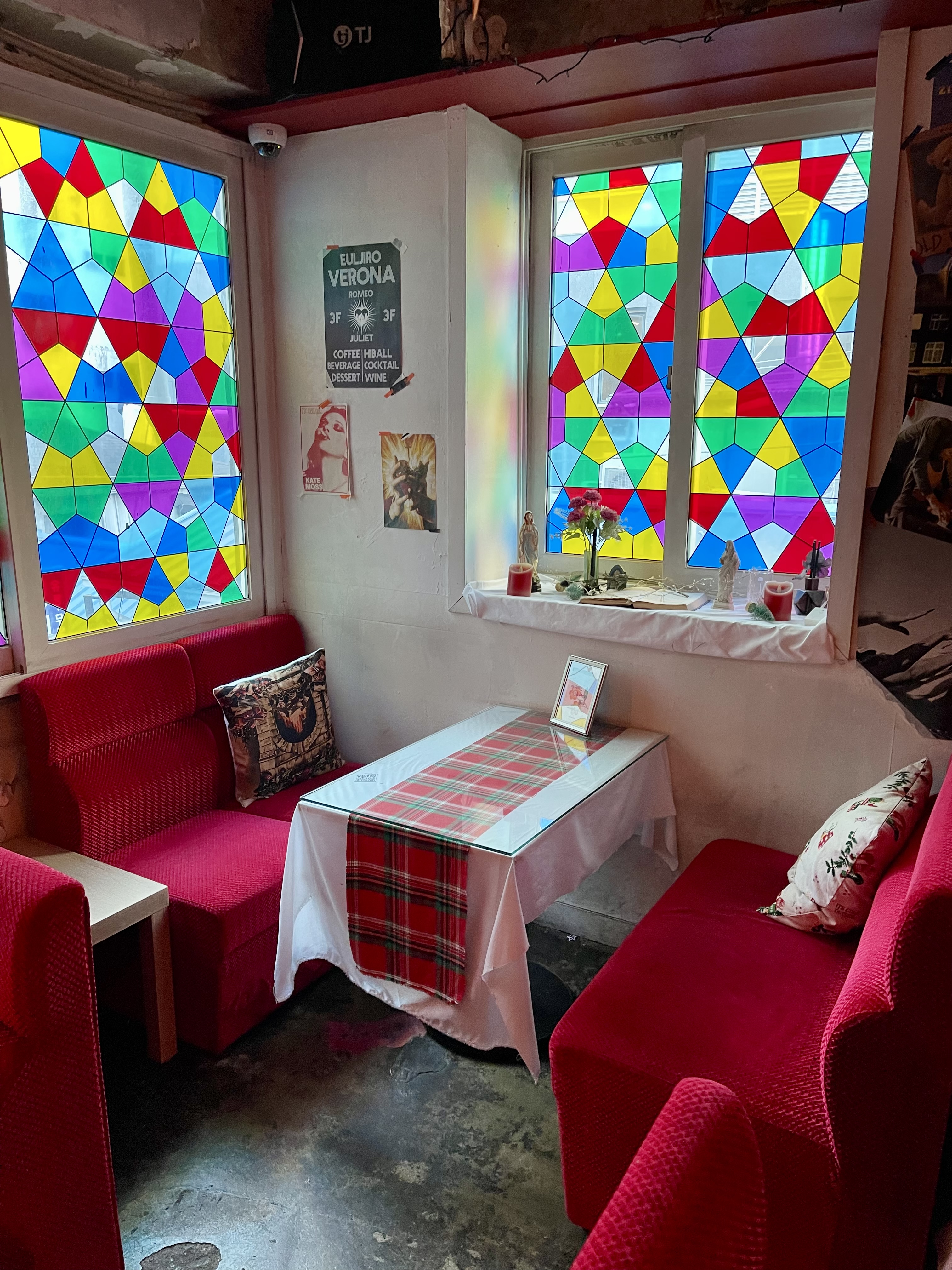 편안한 의자와 다방 같지만 크리스마스 같은 분위기