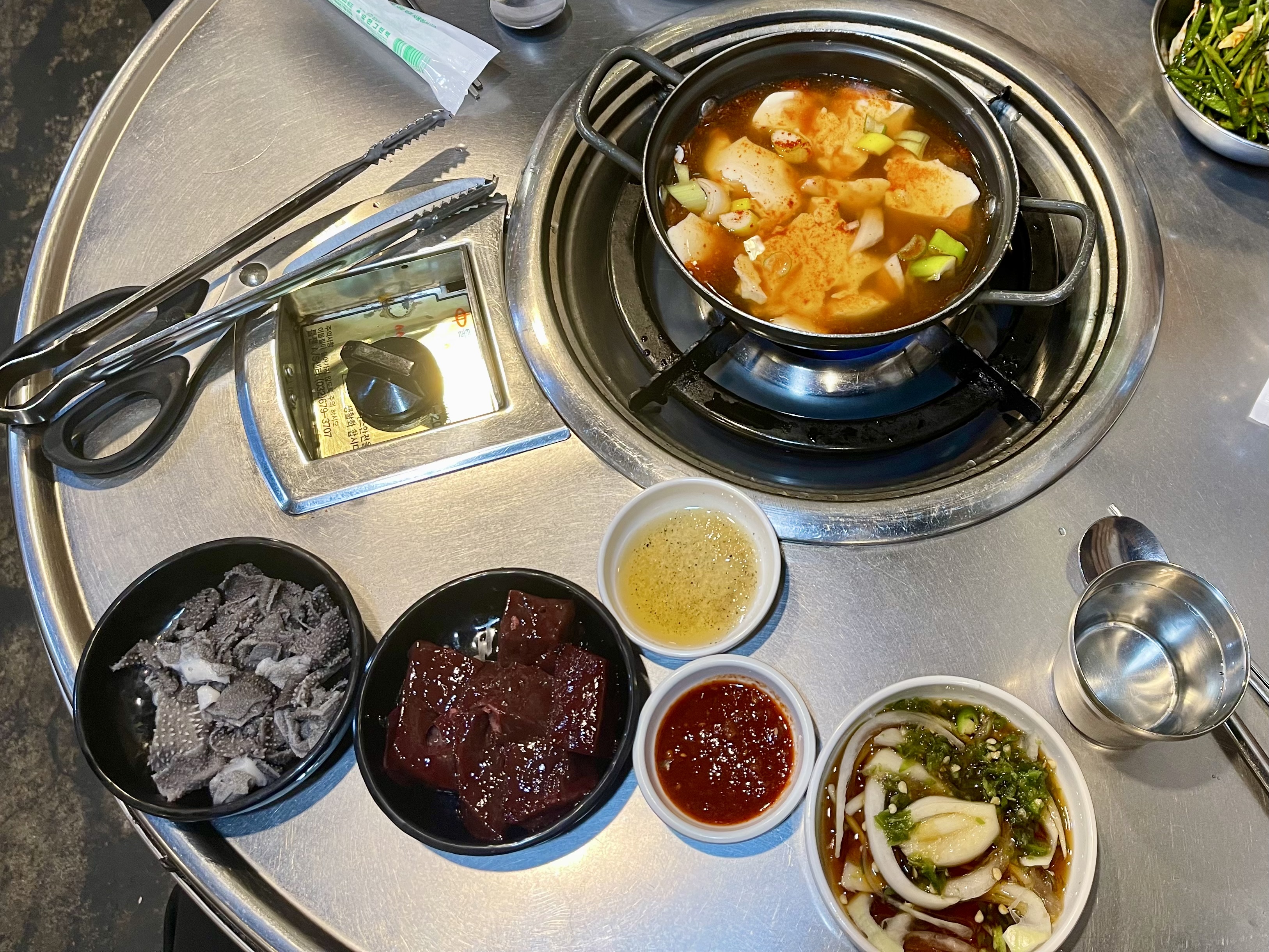밑반찬으로 간, 천엽, 순두부찌개가 제공된다.