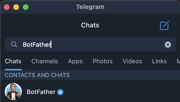 먼저, Telegram 앱에서 @BotFather를 검색해 대화를 시작합니다.