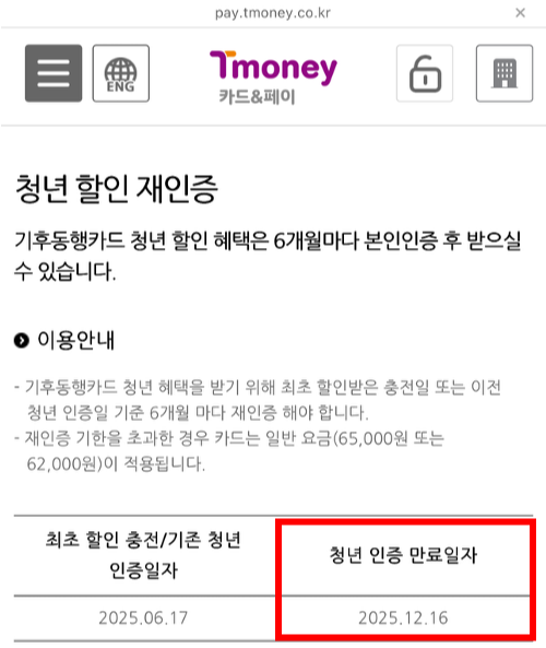 - 카드/할인(요금) 등록 - 기후동행카드 청년 할인 - 청년 할인 재인증