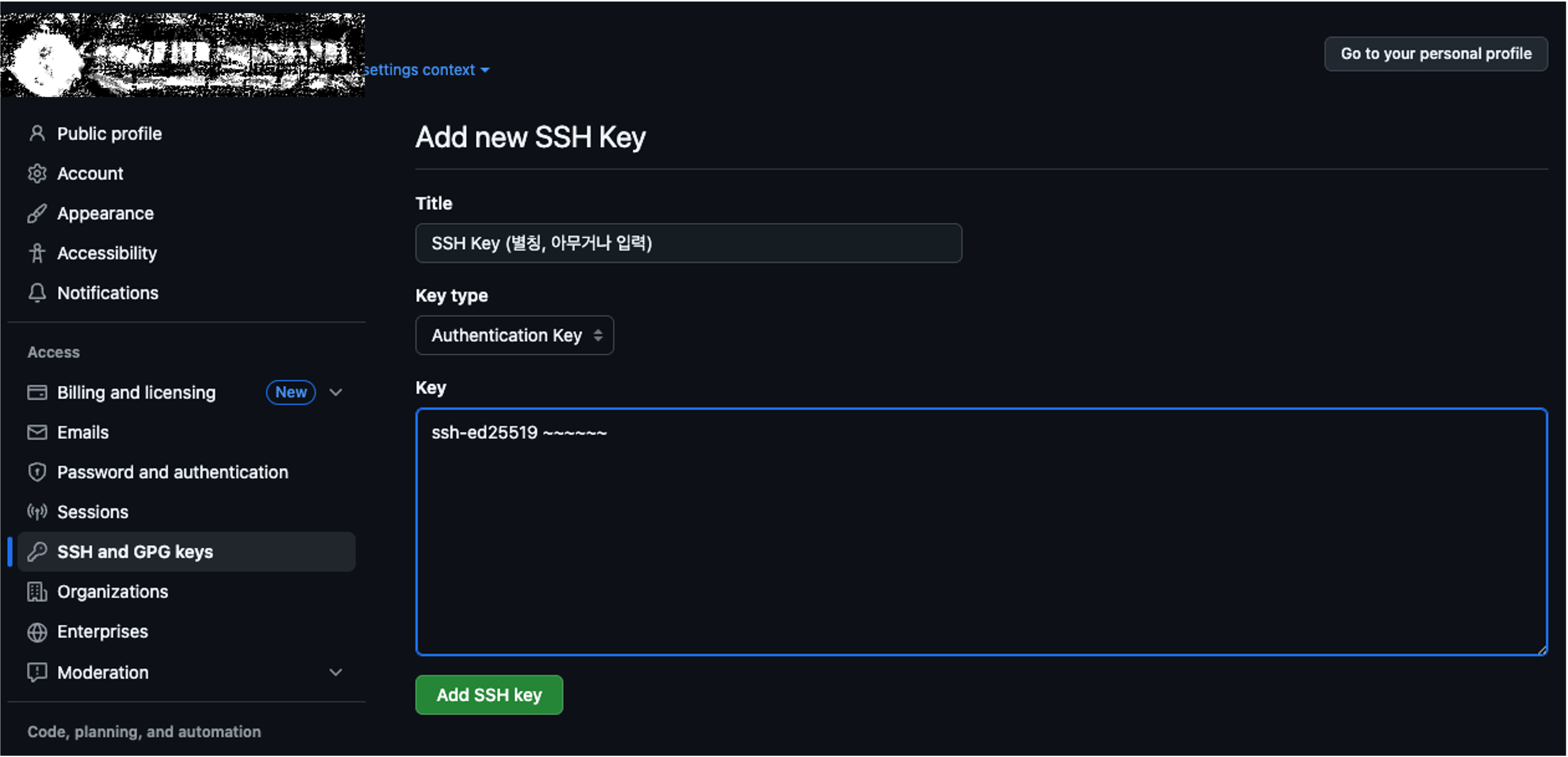 - Github - Settings - SSH and GPG keys - New SSH Key - Key 붙여넣기 - Add SSH Key