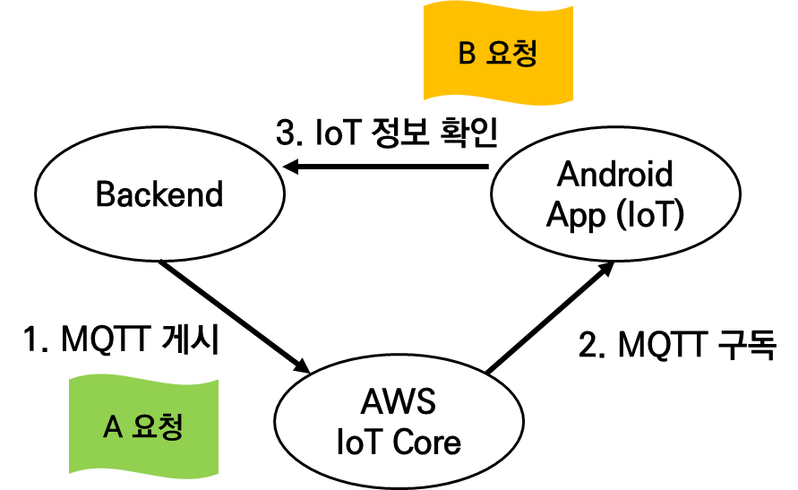 - IoT에 대한 단순 활성화 여부라면, Backend 서버에서 보낸 A 요청이 IoT 서버에서 B 요청을 요구하게끔 설계한다.