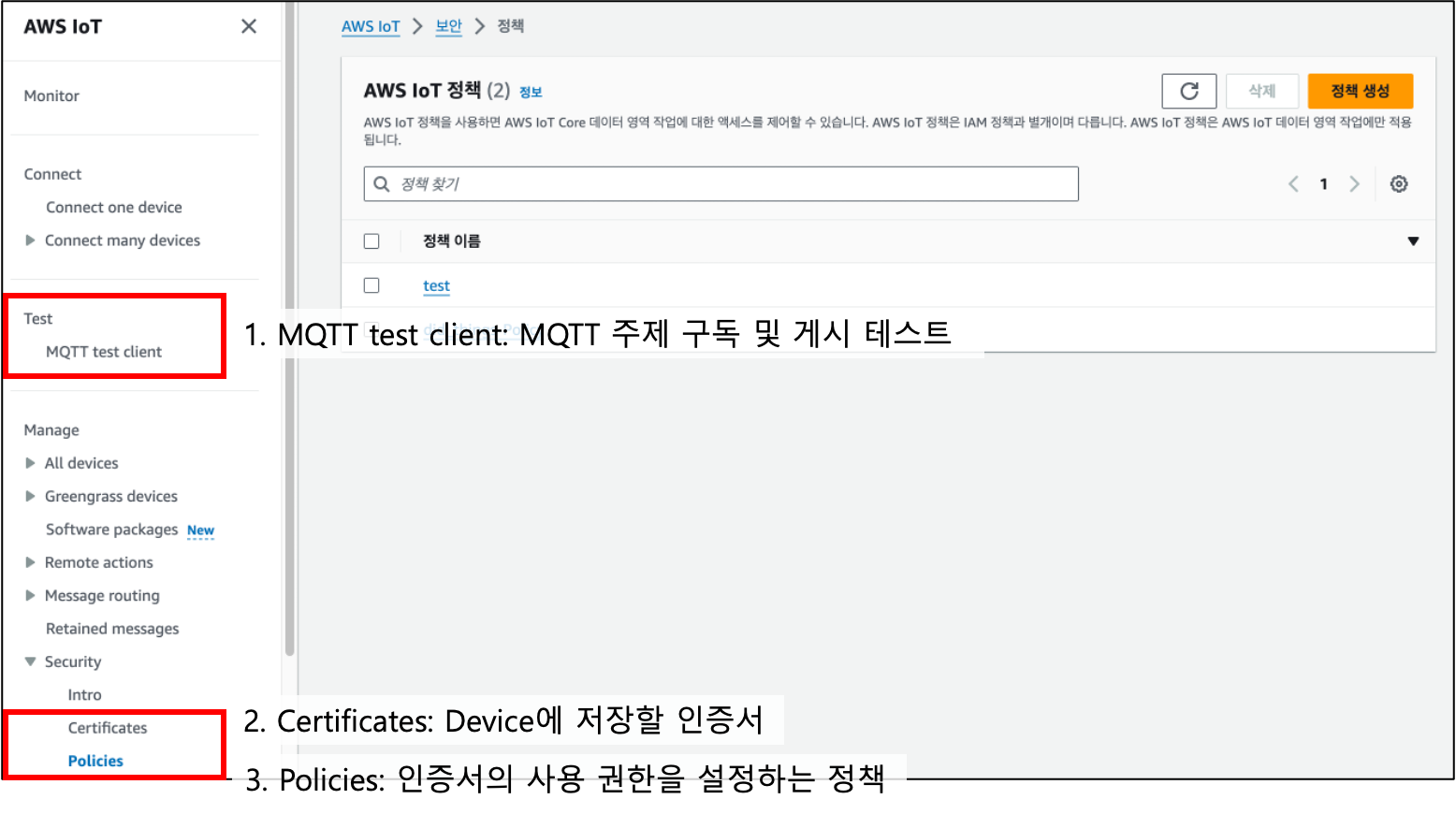 AWS IoT Core 서비스를 활용하면서 기본적인 설정 방식이 개선되는 UX로 인하여 타 포스팅과 다르게 설정되어 있는 부분이 있었다.