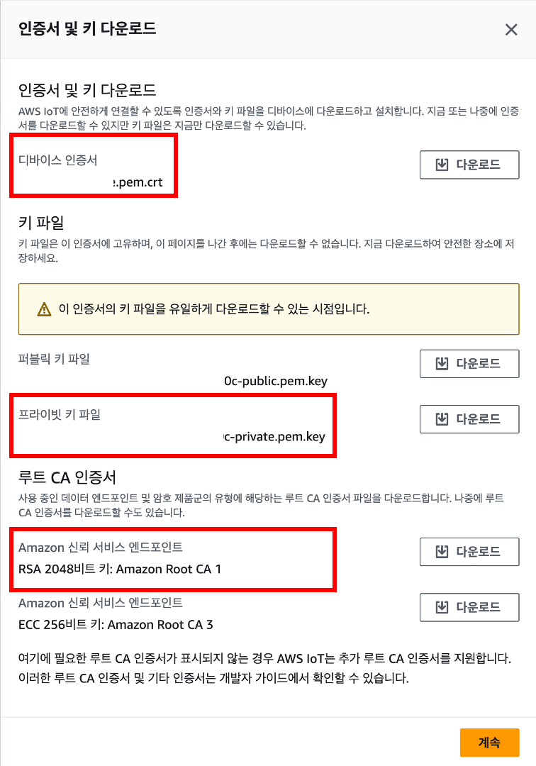 - crt, private, CA1 파일을 통해 AWS IoT Core - Device 통신이 수행되게끔 설정할 수 있다.