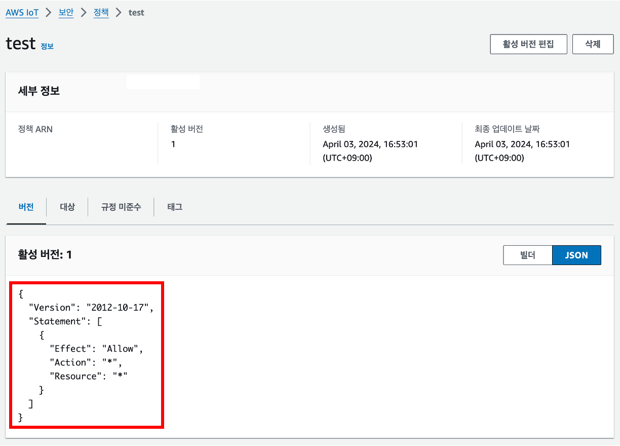 - 활성 버전 : Statement 내에 주제 게시 및 구독 등 AWS IoT Core 관련 기능을 JSON으로 구성할 수 있다.