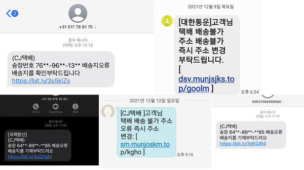 - 흔히 사용하는 택배사, 쇼핑몰 등으로 사칭하여 현재 발송 중인 택배가 있다고 전달 받을 수 있다.