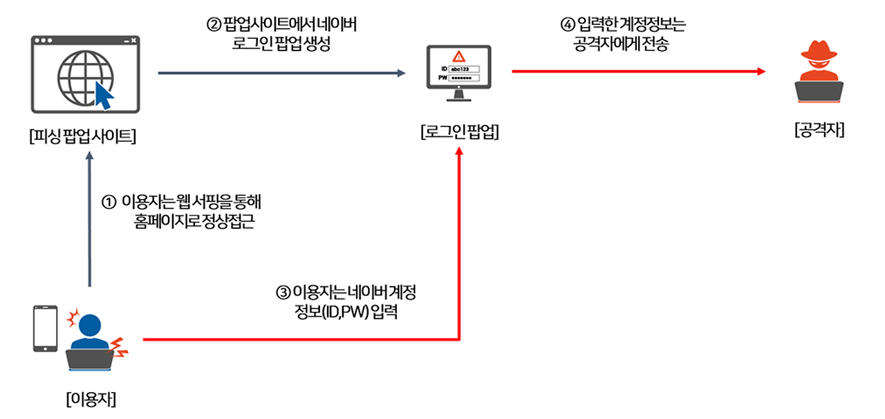 - 눈에 보이는 화면은 정상적인 화면과 피싱 화면이 동일하므로 입력한 계정 정보 등이 공격자에게 넘어갈 수 있다.