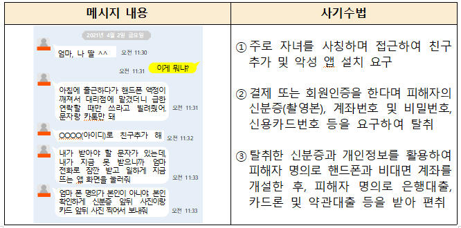 - 문자 메세지나 카카오톡을 통해 학자금이나 용돈 등 간단한 요청을 공격자에게 자녀 등으로 위장된 수신을 받을 수 있다.
