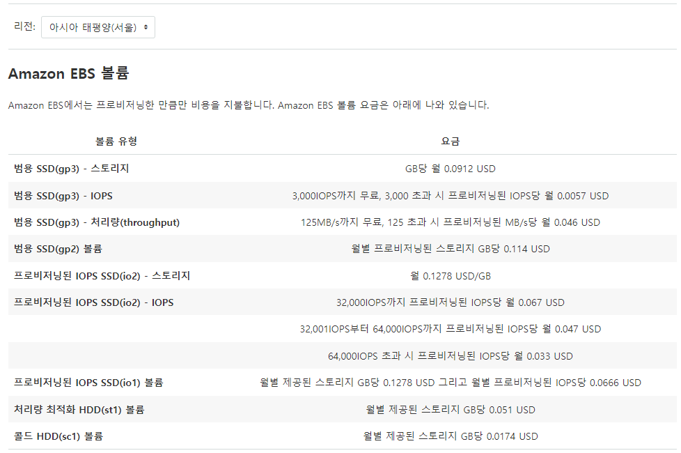 - 저장공간 300GB의 1ea 인스턴스를 사용한다고 가정하였을 때, 과금량은 $0.0174 * 270GB이다.