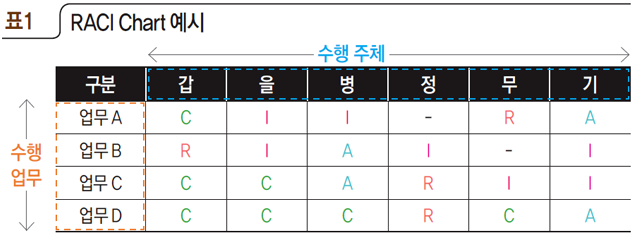 - RACI (Responsible, Accountable, Consulted, Informed) 차트