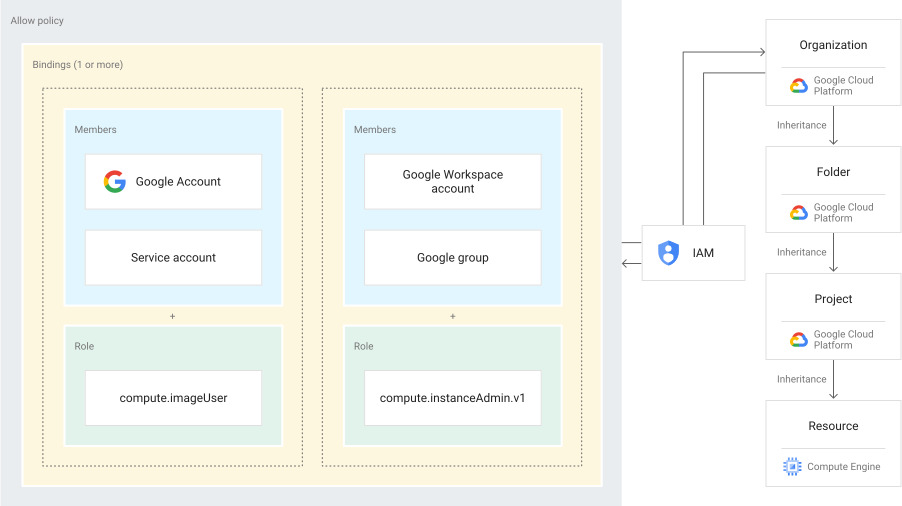 - 주 구성원 : 주 구성원은 Google 계정(최종 사용자의 경우), 서비스 계정(애플리케이션 및 컴퓨팅 워크로드의 경우), Google 그룹 또는 리소스에 액세스할 수 있는 Google Workspace 계정이나 Cloud ID 도메인일 수 있습니다. 주 구성원마다 고유 식별자(일반적으로 이메일 주소)가 있습니다.