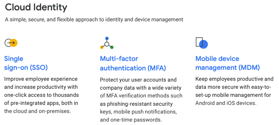 - 해당 과정에서 Google의 통합 ID, 액세스, 앱, 엔드포인트 관리(IAM/EMM) 플랫폼 기능 수행이 필수적