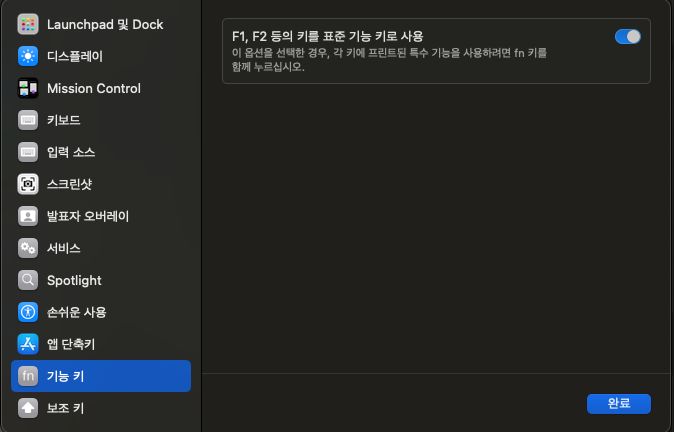 - 기능 키 - F1, F2 등의 키를 표준 기능 키로 사용 ON