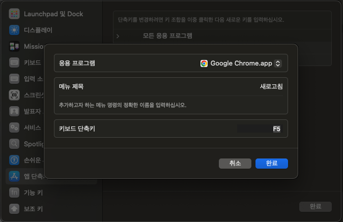 - 앱 단축키 - + - Google Chrome.app, 페이지 새로고침, F5 설정