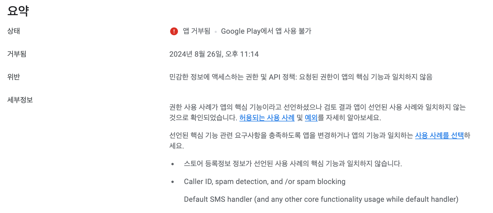 해당 권한은 민감한 권한으로 단순히 사유를 변경하는 것으로 해결이 불가능하여,