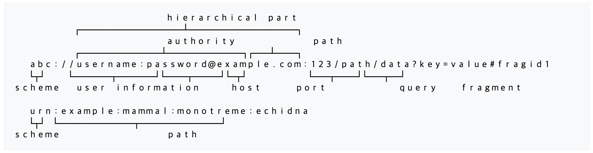 - URI는 일반적으로 다음과 같은 구조를 가지고 있다: scheme://authority/path?query#fragment.