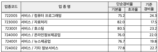 | 가 | 제조업, 숙박 및 음식점업, 전기·가스·증기 및 공기 조절 공급업, 수도·하수·폐기물처리·원료 재생업, 건설업(비주거용 건물 건설업 제외), 부동산 개발 및 공급업(주거용 건물 개발 및 공급업 한정), 운수업 및 창고업, 정보 통신업, 금융 및 보험업, 상품 중개업, 욕탕업, 인적 용역 제공 사업 | 3,600만 원 미만 |
