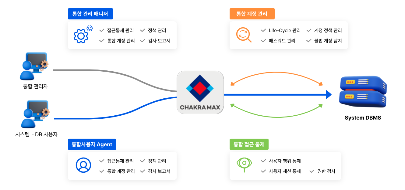 Chakra Max는 DAC, SAC, IAM 기능을 통합하여 하나의 인터페이스로 제공함으로써 기대 이상의 시너지를 제공 인프라 보안 환경에 요구되는 각각의 보안 솔루션은 서로 다른 벤더의 제품으로 구성되는
