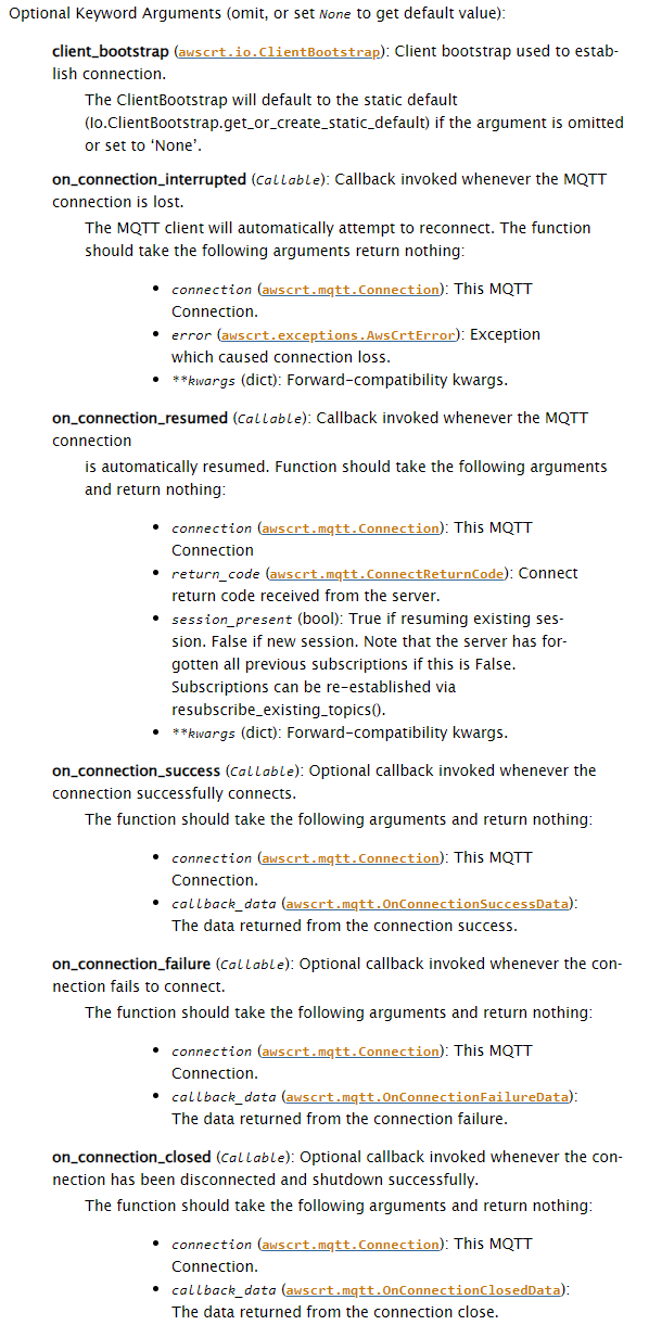 - AWS. AWS IoT Device SDK v2 for Python documentation. https://aws.github.io/aws-iot-device-sdk-python-v2/awsiot/mqtt_connection_builder.html