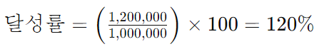 - 예를 들어, 목표 수치가 1,000,000이고 실제 달성한 수치가 1,200,000인 경우 달성률은 다음과 같이 계산됩니다.
